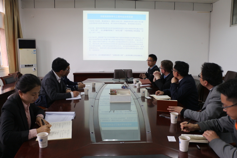 陈玉林副院长对王焕宝副院长一行的到来表示了热烈欢迎。他简要回顾了学院发展的历史沿革,详细介绍了应用物理专业的本科生人才培养方案、课程设置及教学计划运行情况。随后,光电工程系主任刘玉柱对光电信息科学与工程专业特色、实践教学、人才培养成效等方面进行了总体介绍,裴世鑫老师就光电专业的实践教学平台搭建、实验课程安排、在线课程等做了经验交流。