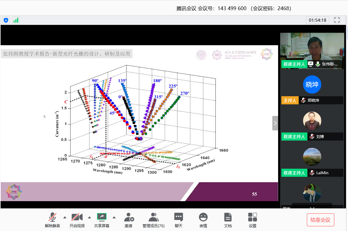 4月29日晚上,南京信息工程大学60周年校庆活动暨2020年科技活动月—沿信息高端论坛(第3期)如期在线举行。本次活动邀请到南开大学现代光学研究所张伟刚教授作题为《新型光纤光栅的设计、研制及应用》的学术报告。本次论坛采用“线上”的方式进行,学术报告由物理与光电工程学院刘博教授主持共吸引了我校师生约90余人。