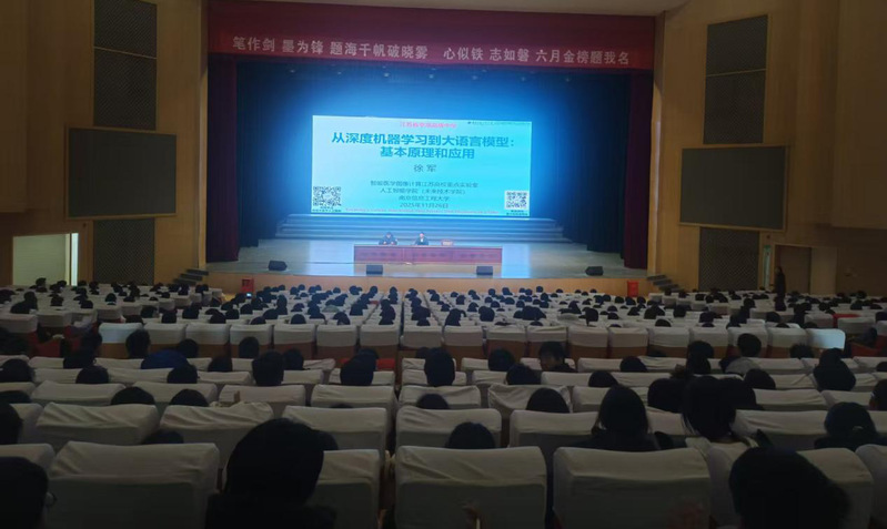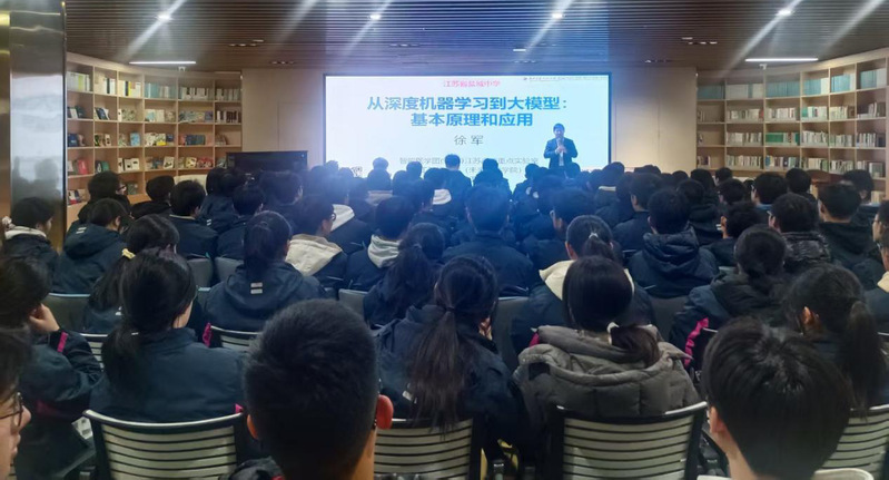徐军教授面向江苏省盐城中学、盐城市亭湖高级中学的学生,作了题为《从深度机器学习到大模型:基本原理和应用》的科普讲座。他从机器学习的基础知识入手,系统讲解了人工智能的核心原理,并梳理了从传统机器学习到深度学习,再到大模型的技术演进脉络。讲座中不仅结合图像识别(如人脸识别)等案例进行了直观演示,还深入阐述了该技术通过自动驾驶、疾病诊断等应用对生产与生活产生的深刻影响,成功激发了同学们对人工智能的浓厚兴趣与探索热情。