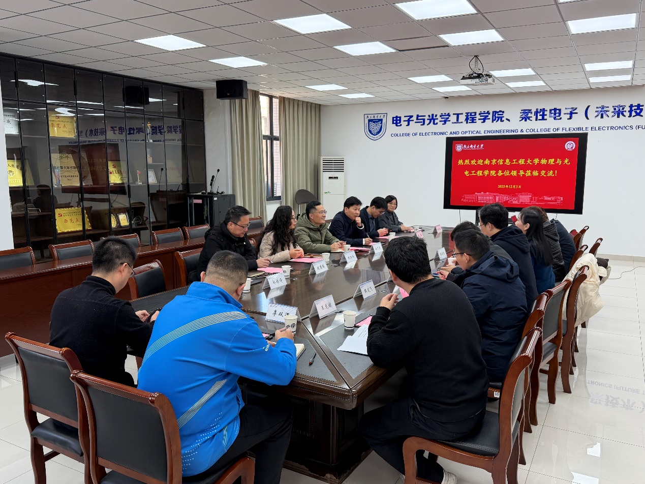 为深入贯彻落实新时代高等教育高质量发展要求,学习国内双一流高校兄弟学院先进的办学经验,科学谋划学院“十五五”编制工作,推动我院在党建思政、师资引育、学科专业建设和人才培养等方面提质增效,12月3日,物理与光电工程学院院长涂兵、党委书记徐志勇带队,率学院领导班子和骨干教师代表一行7人赴南京邮电大学电子与光学工程学院、柔性电子(未来技术)学院开展专题调研交流,受到该院的热情接待。调研座谈会由南邮电光柔院党委书记黄丽亚主持,该院院长余林蔚及学院领导班子成员和骨干教师共 10 人出席会议,双方围绕学科与专业建设、人才培养与竞赛实践、党建思政等方面展开了深度交流。