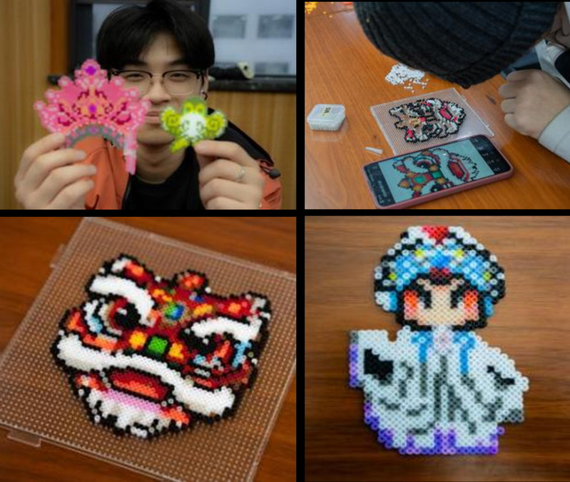 活动伊始,主持人以“非遗之美”为题开启了这场传统与现代的对话,巧妙地将中式漏窗的几何美感与拼豆的点阵逻辑相联系,阐述了如何用数字化的颗粒语言,重新编写流传千年的文化代码。随后,主持人以“红色中国结”为引,展示分享了如何将传统符号转化为像素坐标,为接下来的创作奠定了灵感基础。在接下来的拼豆创作环节,同学们使用专业像素工具软件,将手机中收藏的非遗纹样、传统图案一键转译为可制作的拼豆蓝图。同学们可以根据个人喜好调整色彩权重,生成独一无二的专属“制作代码”。这一环节极大地激发了大家的创作热情,让每个人都成为自己作品的“设计师”。大家将一颗颗彩色拼豆精准地排列在底盘网格上,伴随着拼豆落入格子的细微声响,原本空白的画板逐渐被色彩填满。从轮廓的艰难勾勒到细节的耐心填充,大家全神贯注,在“一豆一格”的拼搭中体验着指尖修行的治愈感。零散的豆粒在熨斗的熨烫下奇迹般地凝结成一个坚固而精美的整体,一幅幅承载着个人巧思与文化意蕴的专属纪念品就此诞生。